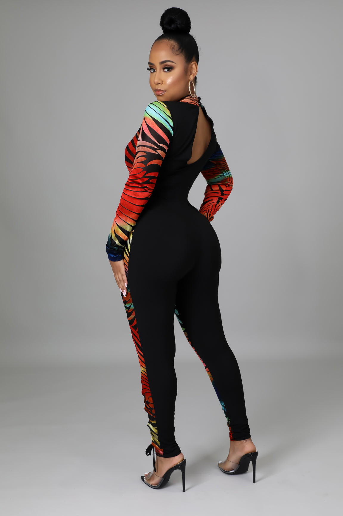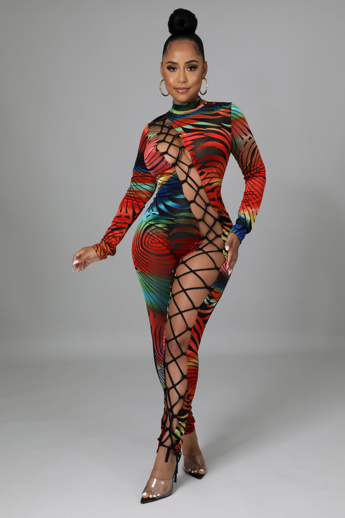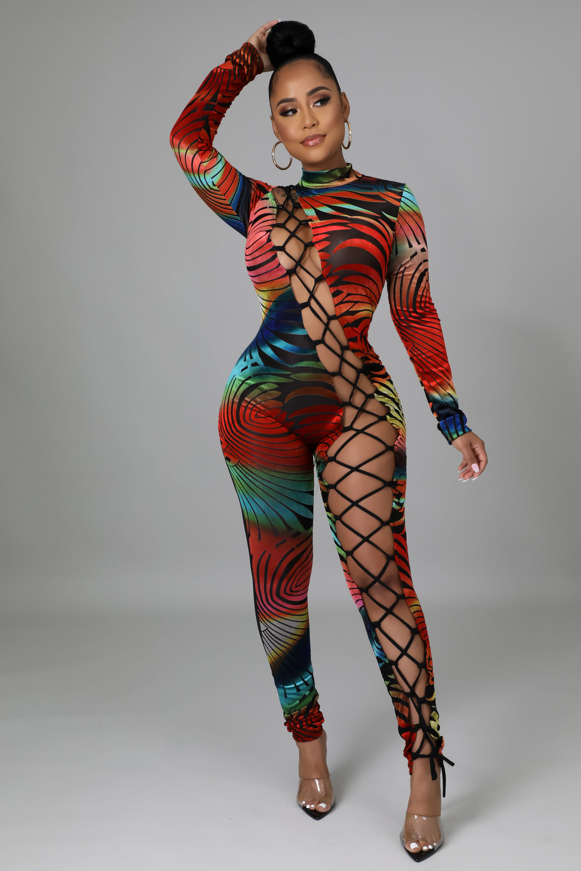 Claw me out is a comfortable and stylish jumpsuit constructed with stretchy polyester. It is designed to be ready-to-wear, with ankle lacing that cinches the fit and allows for personalized adjustments. With its fitted silhouette, you can move freely yet maintain a sleek and flattering look.