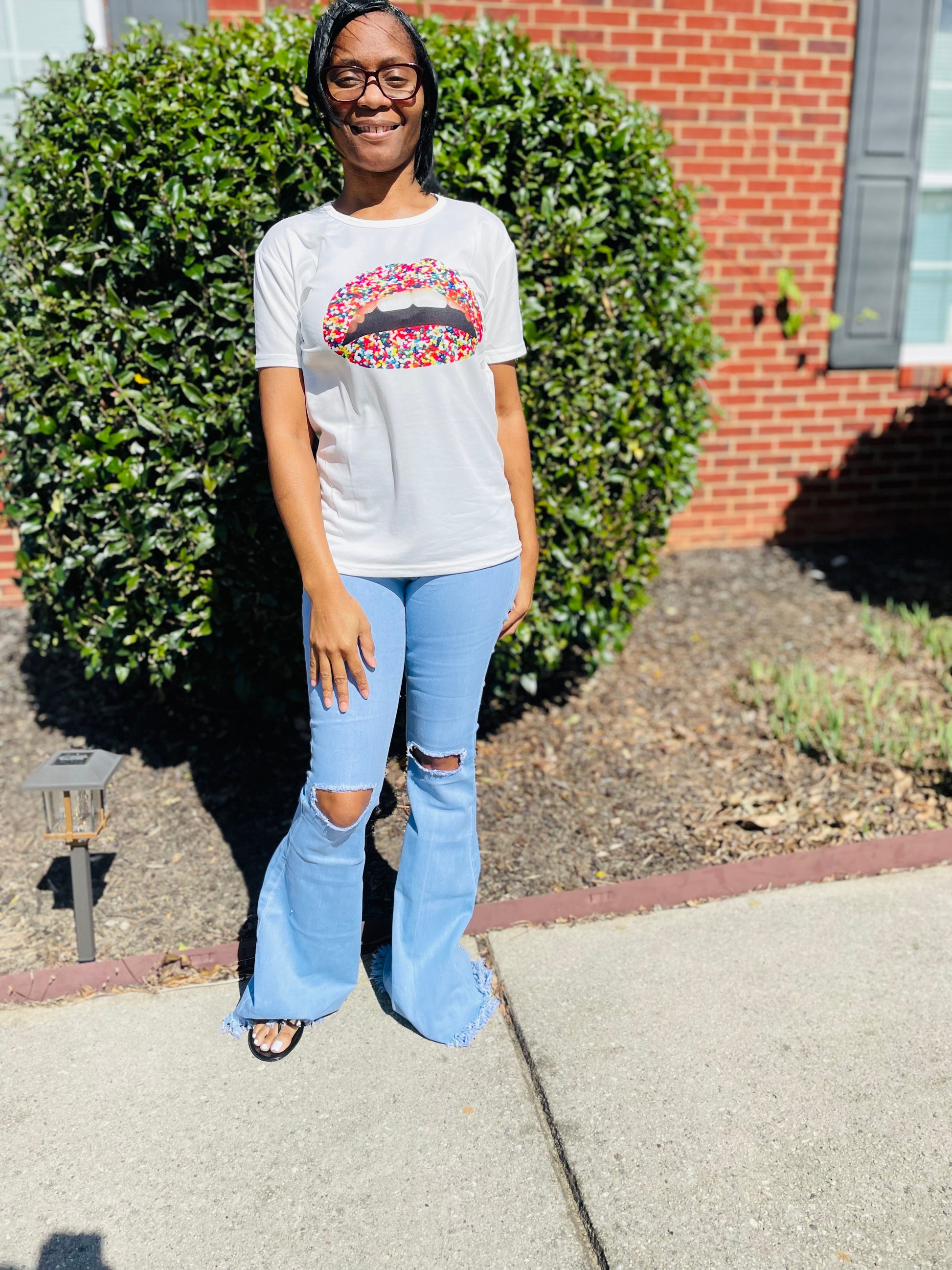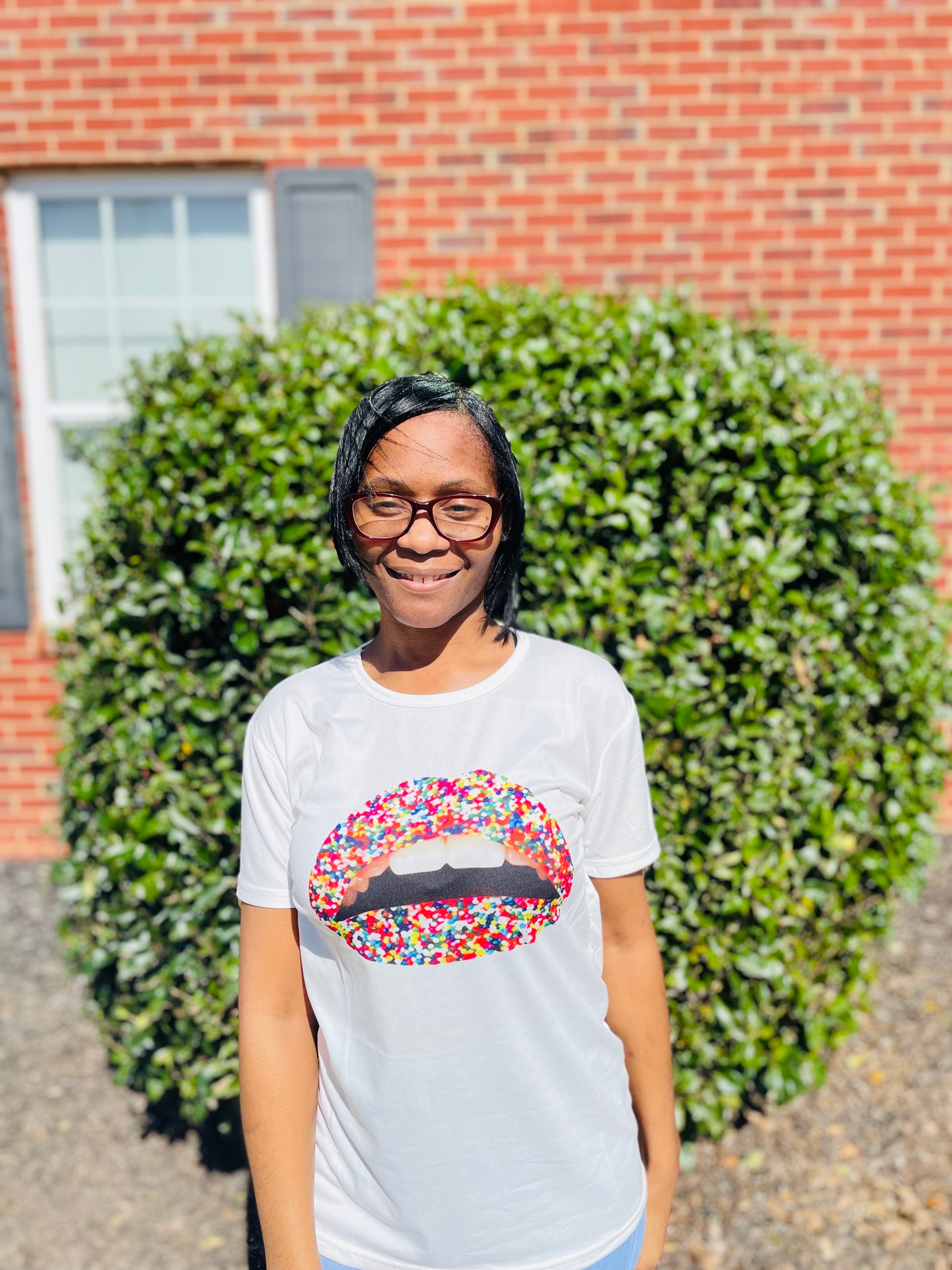 Our Sweet like Candy Shirt is sure to tantalize your eye. We've combined cotton and polyester for a comfortable, lightweight feel, and decorated it with sweet treats and colored candy lips for a playful look. Enjoy a taste of style with this shirt!